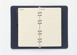 手触りのいい、皮製の表紙のシステム手帳です。ちょっとしたメモにはやっぱり手帳が便利!色はつやのあるブラックです。追加料金300円で、表紙にあなたの名前を焼印します。世界で一つだけのオリジナル手帳、いかがですか?