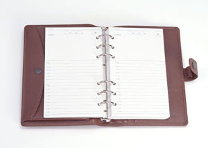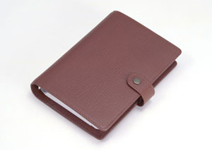 手触りのいい、皮製の表紙のシステム手帳です。ちょっとしたメモにはやっぱり手帳が便利!